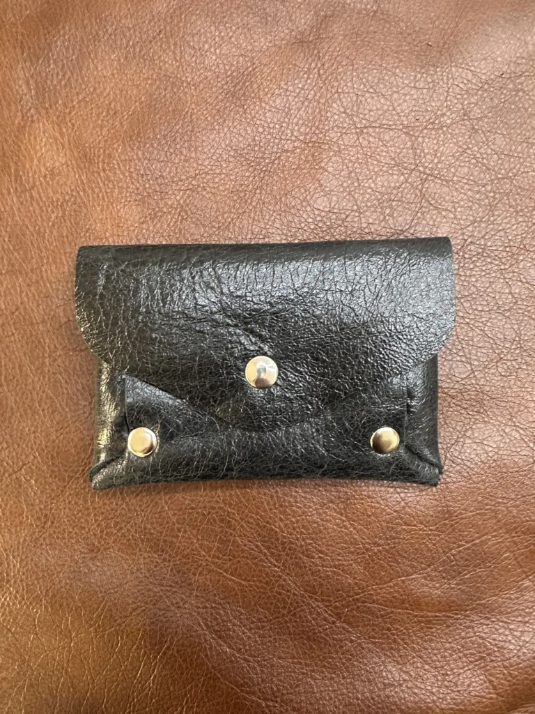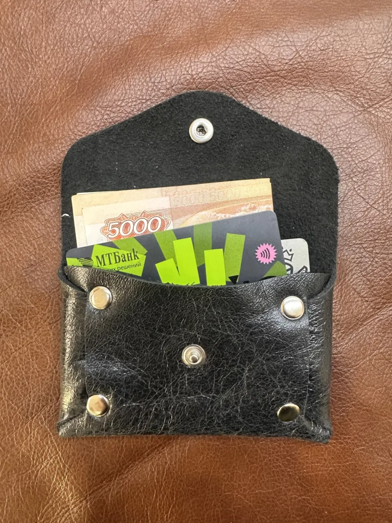 Картхолдер выполнен в минималистичном стиле, что позволяет ему сочетаться с различными образами. Металлические кнопки обеспечивают надежное закрытие, предотвращая случайное открывание. Каждый элемент изделия изготовлен с учетом требований к качеству: швы прочные, кожа ровная без дефектов. Внутри аксессуара находится одно отделение, достаточное для хранения нескольких карт или небольшого количества купюр.