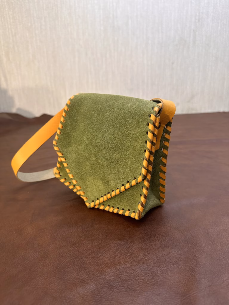 - Внешняя часть из натуральной замши зелёного цвета
