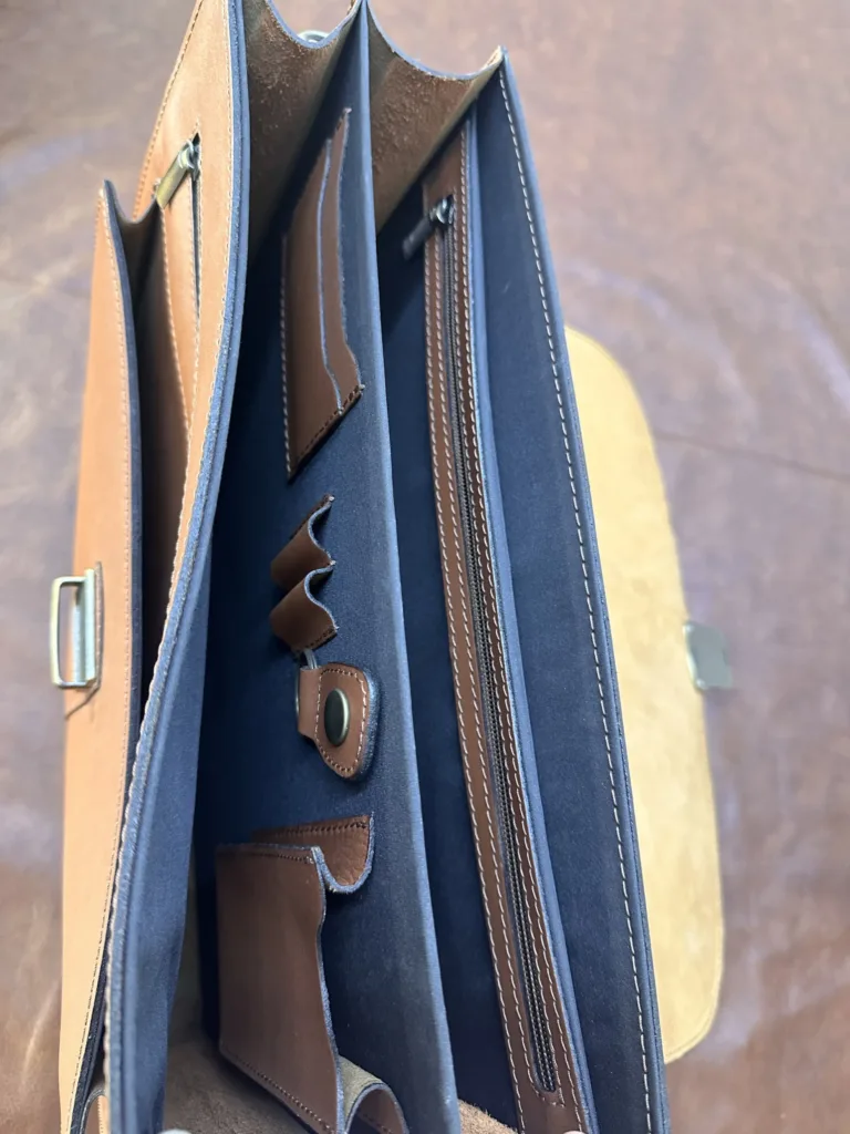 Каждый элемент портфеля изготовлен с использованием точной технологии. Швы выполнены аккуратно, без неровностей, что предотвращает разрывы и износ. Кромки изделий обработаны специальным методом, который исключает распускание и придает портфелю премиальный вид. Металлическая фурнитура, включая замок и ручку, не подвергается коррозии и сохраняет блеск на протяжении многих лет.