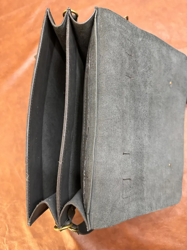 Портфель имеет два основных отделения, закрывающихся на ремни с пряжками. Внутри предусмотрено отделение для документов формата A4 и несколько карманов для мелочей. Ремень для переноски через плечо регулируется по длине. Внешние края портфеля обработаны так, чтобы исключить износ в местах частого соприкосновения. Металлические детали не скрипят и сохраняют свой внешний вид даже после длительного использования.