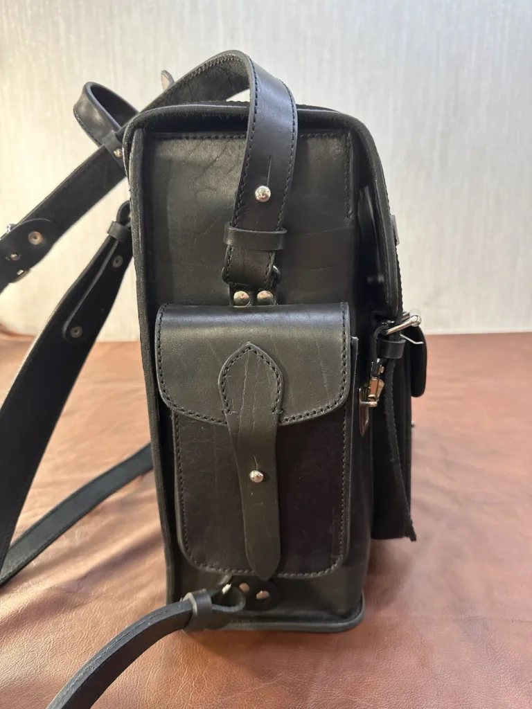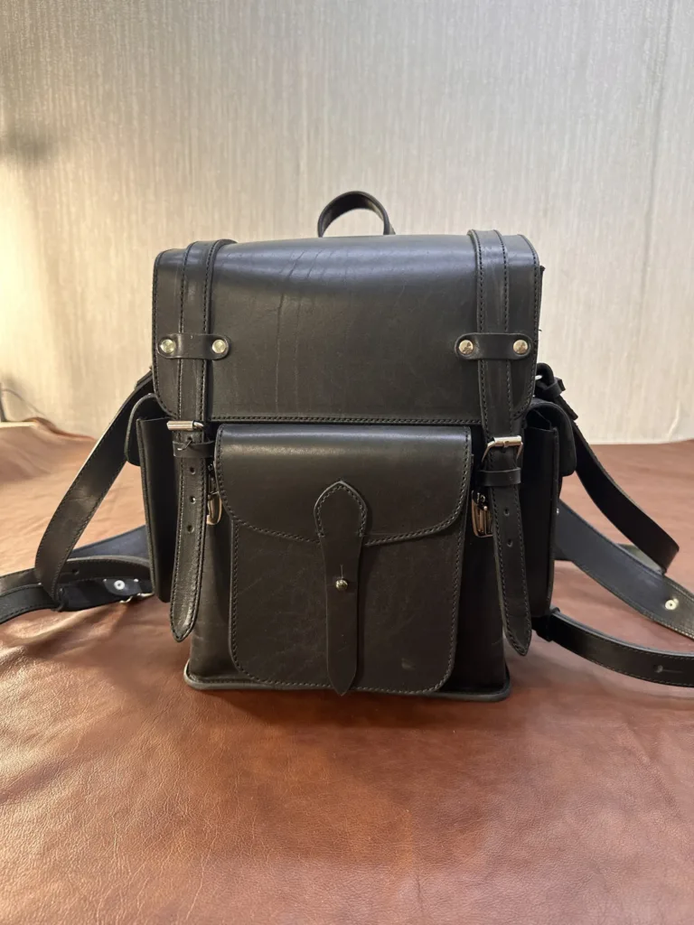 Рюкзак-трансформер изготовлен из натуральной шорной кожи крупного рогатого скота, которая отличается плотностью и долговечностью. Толщина материала позволяет изделию сохранять форму даже при заполнении. Все швы проклеены и прошиты крепкой капроновой нитью, что усиливает прочность конструкции. Внутри расположены три вместительных кармана и одно основное отделение, удобное для хранения ноутбука, документов и личных вещей.