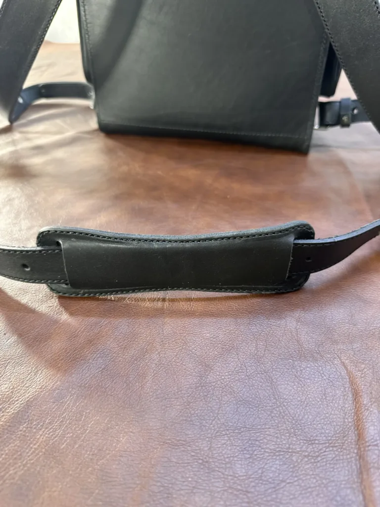 Внешний вид изделия выглядит строго и элегантно. Чёрный цвет универсален, сочетается с различными стилями одежды. Толстая кожа защищает содержимое от влаги и механических повреждений. Подробные размеры позволяют определить, подходит ли рюкзак для конкретных задач: высота 35 см, ширина 29 см, толщина 17 см.