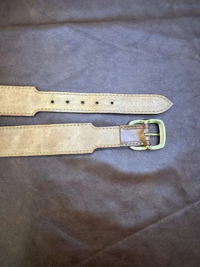 Ремень прошел ручную покраску меренге, что придает ему теплый оттенок и естественный вид. Все элементы выполнены с учетом требований к качеству и долговечности. Общая длина изделия с пряжкой составляет 100 см, ширина пряжки — 35 мм, а утолщение — 53 мм.