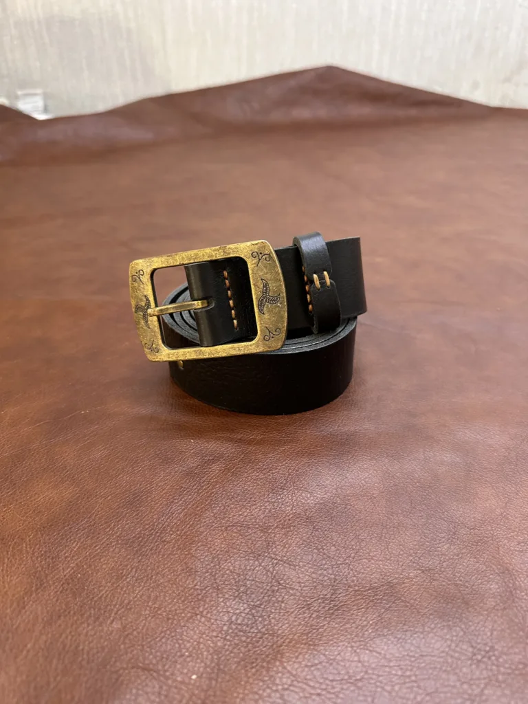 Обратная сторона ремня закатана, что минимизирует излишнюю толщину и повышает удобство в использовании. Ручная обработка краев и шов придают изделию ручной шарм, подчеркивая его эксклюзивность. Бронзовая пряжка с рельефным узором дополняет общий стиль, не добавляя лишнего веса.