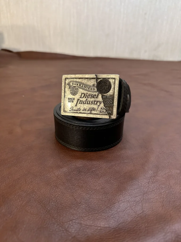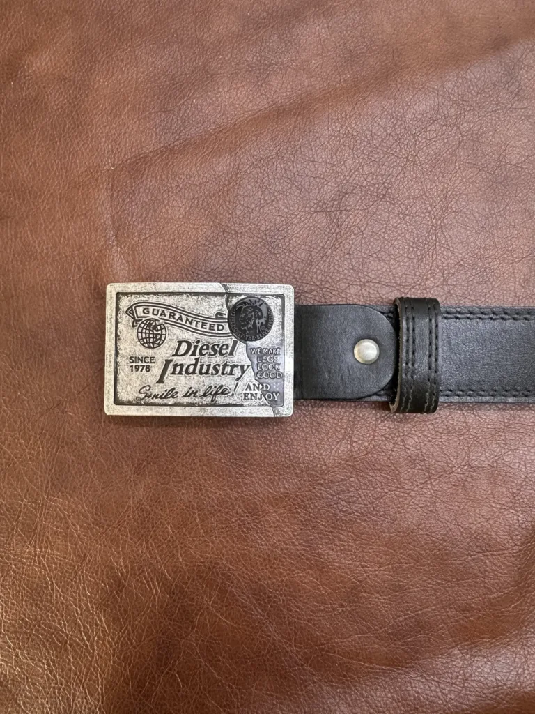 Каждый элемент ремня проработан с вниманием к мелочам. Швы выполнены ручной работой, что обеспечивает их равномерность и надежность. Кромки тщательно обработаны, предотвращая их расслаивание. Металлическая пряжка с гравировкой «Diesel Industry» обеспечивает удобное крепление и долговечность. Вся фурнитура подобрана для максимальной функциональности.