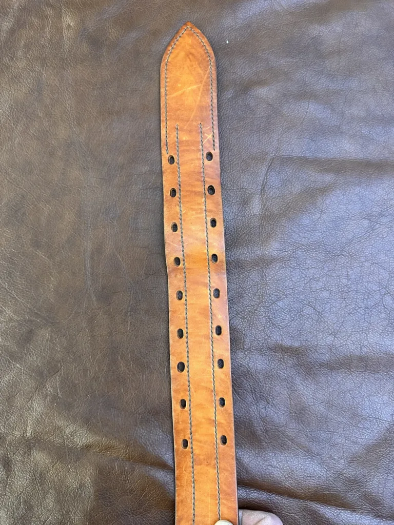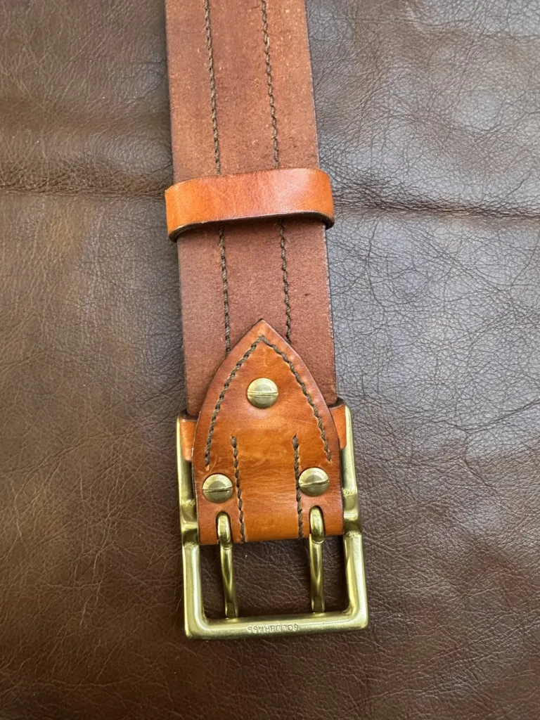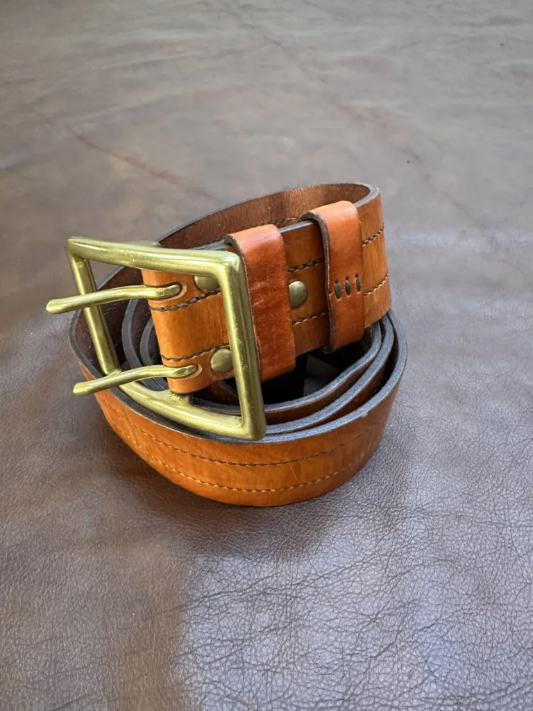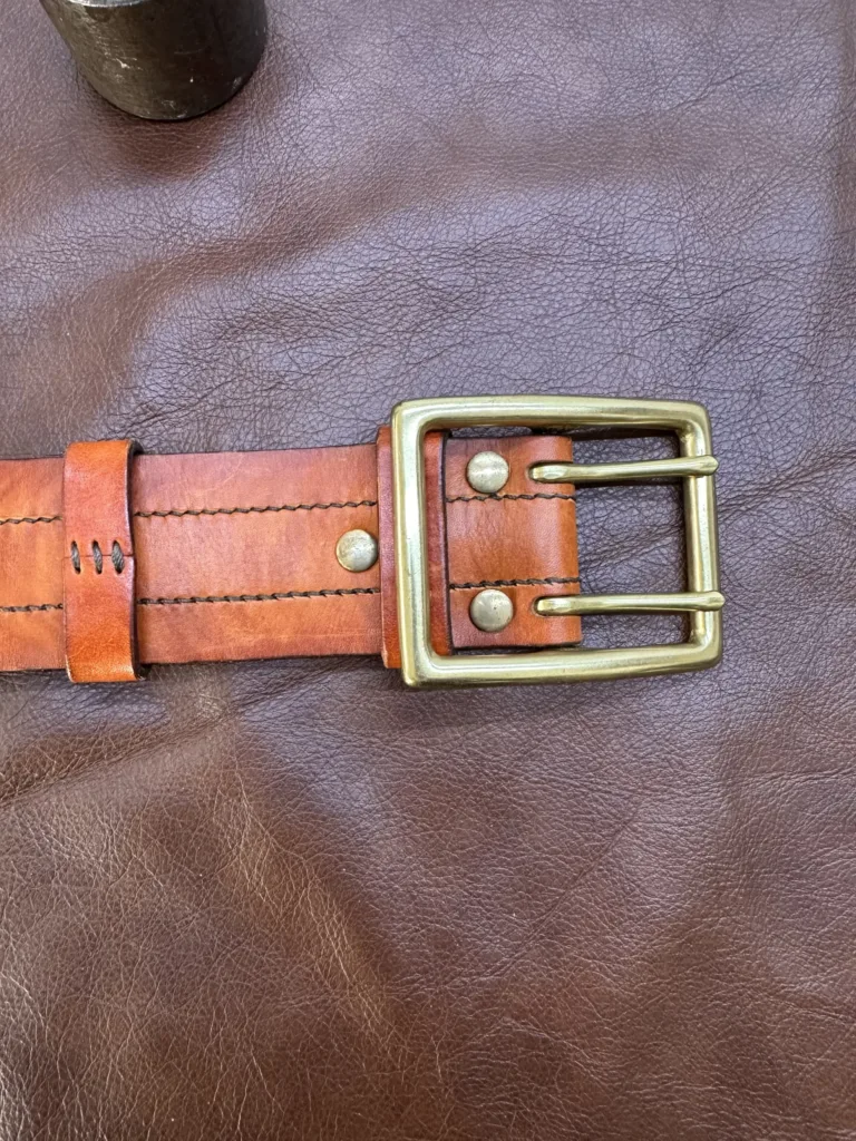 Каждый элемент ремня создан с вниманием к мелочам. Ручной шов обеспечивает надежность соединения, а покраска меренге придает изделию изысканный оттенок. Обработка краев предотвращает их расслоение, а закатка обратной стороны обеспечивает комфорт при ношении. Латунная пряжка не только украшает ремень, но и надежно фиксирует его. Толщина кожи составляет 3,5–4 мм, что делает изделие устойчивым к износу.