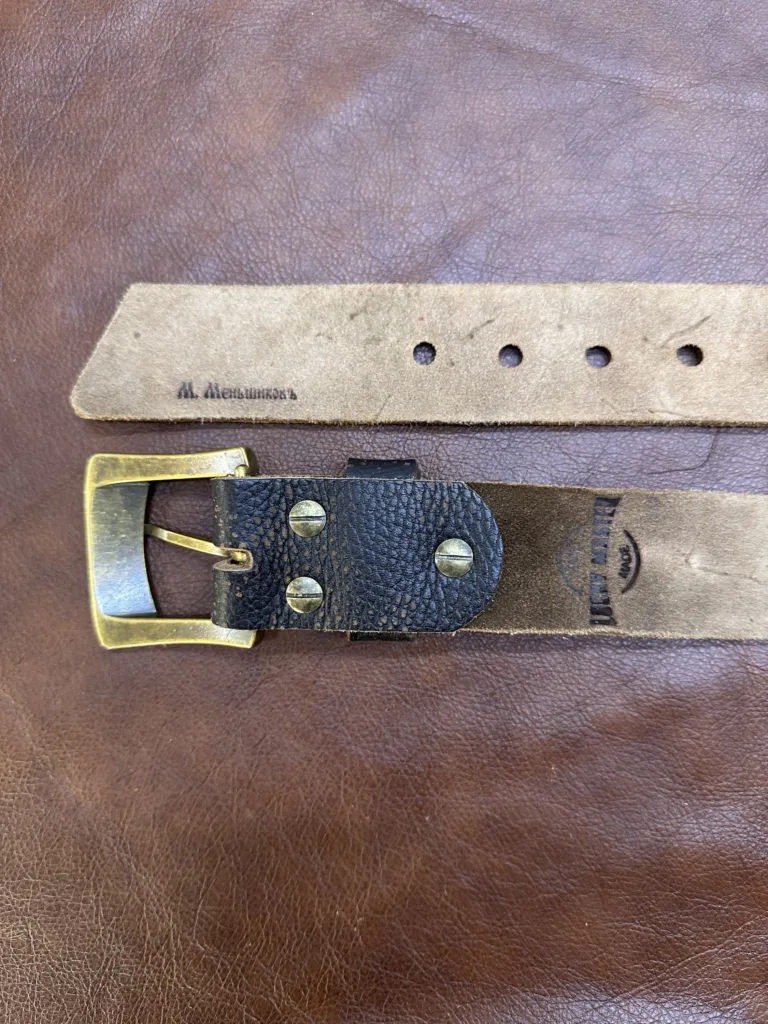 Ремень выполнен из натуральной кожи чепрака, известной своей прочностью и уникальной текстурой. Кожа обрабатывается вручную, что позволяет сохранить естественные свойства материала. Толщина кожи составляет 3,5-4 мм, обеспечивая долговечность и комфорт при ношении. Ширина ремня 4 см, а общая длина с пряжкой — 110 см. Такие параметры делают аксессуар универсальным для разных типов одежды. Текстура кожи чепрака становится еще более выразительной с возрастом, приобретая характерный винтажный вид. Каждый элемент изделия продуман до мелочей, от выбора кожи до окончательной отделки.
