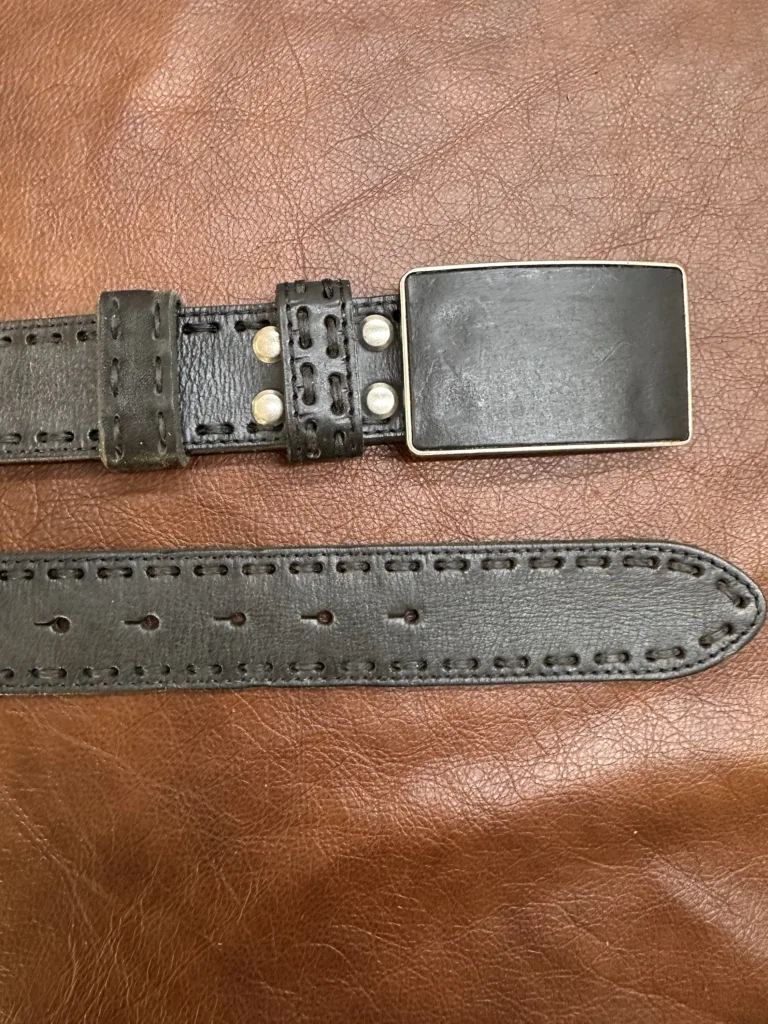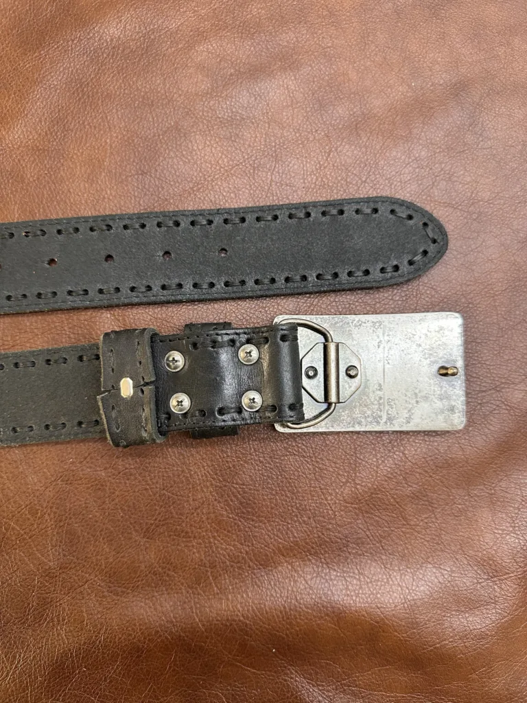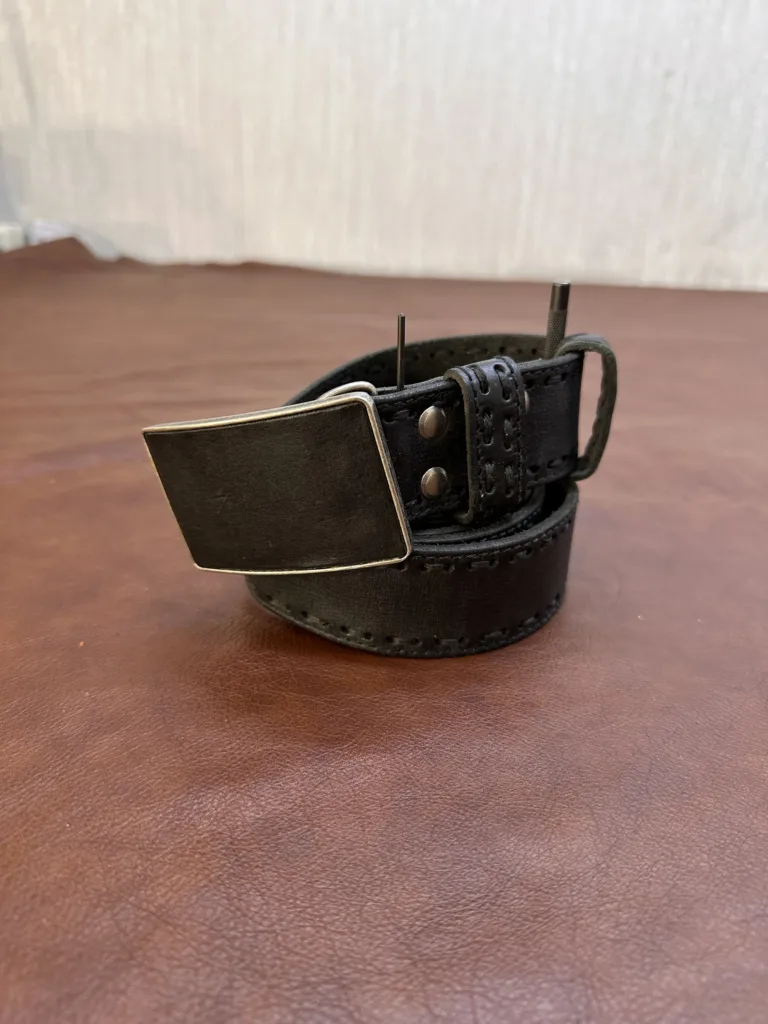 Каждый ремень изготавливается вручную, что гарантирует его уникальность и высокое качество. Точная обработка швов и ровные стежки подчеркивают мастерство исполнения. Пряжка шириной 40 мм выполнена из алюминиевого сплава и обтянута кожей, что обеспечивает устойчивость к царапинам и сохраняет эстетичный вид. Цвет пряжки — старое серебро, который гармонично сочетается с черным цветом ремня.
