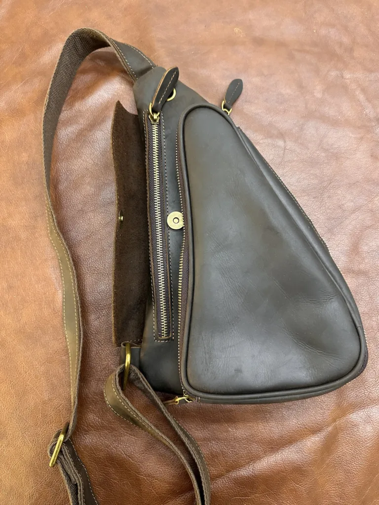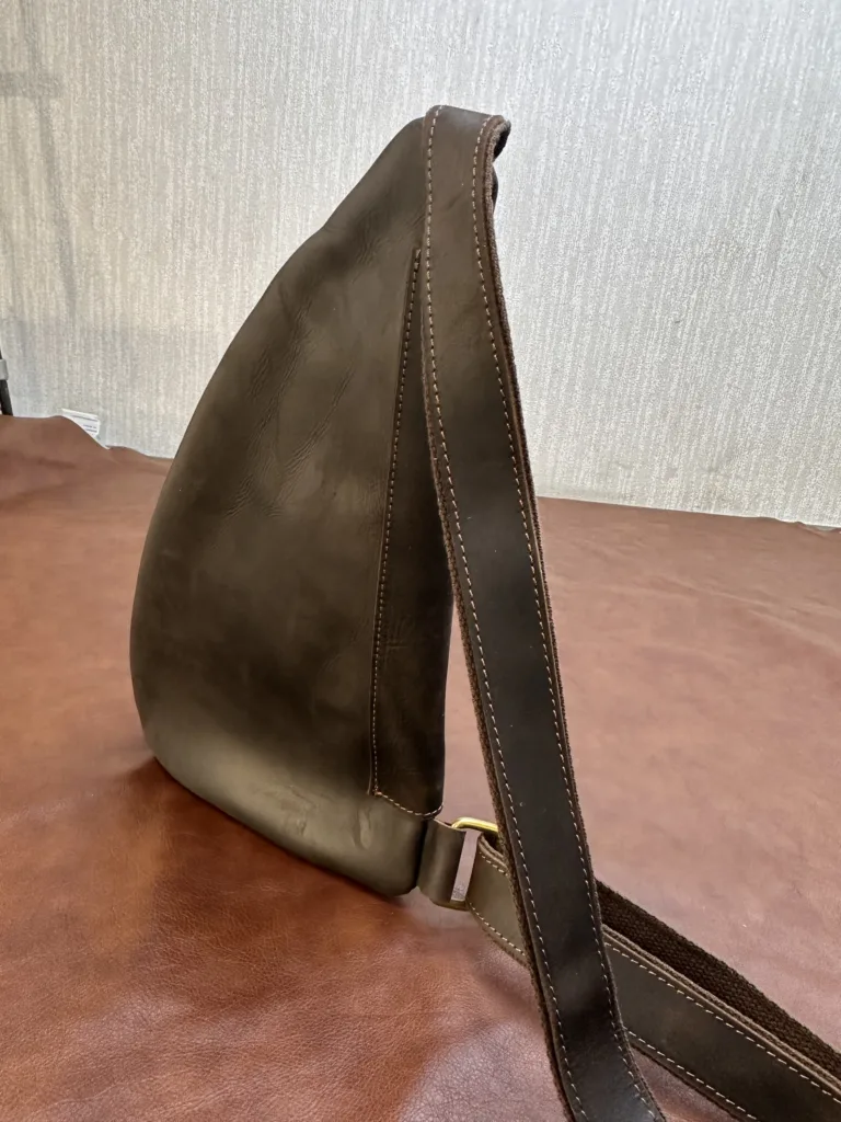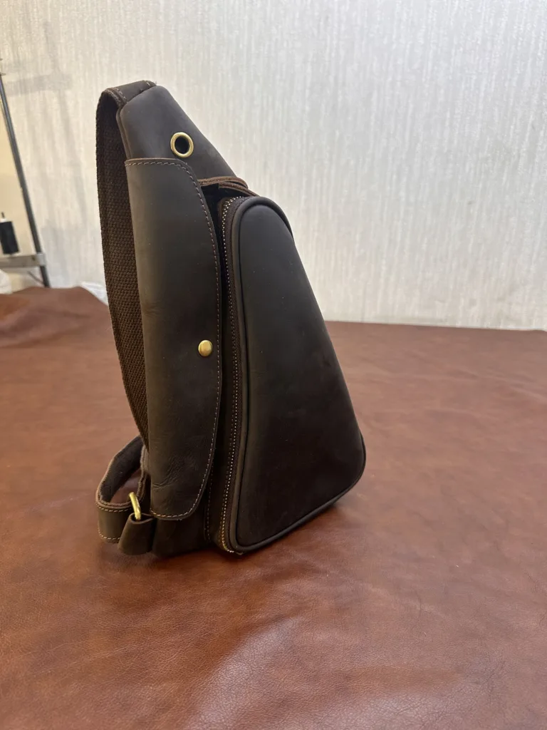 Изделие изготовлено из качественной натуральной кожи, что обеспечивает долговечность и эстетичный вид. Швы выполнены аккуратно, без торчащих ниток. Сумка может использоваться как на груди, так и на плече или спине благодаря регулируемому ремню. Подходит для повседневного использования и формальных встреч.