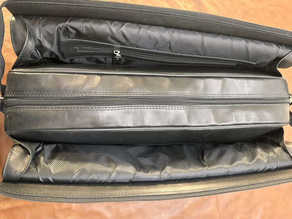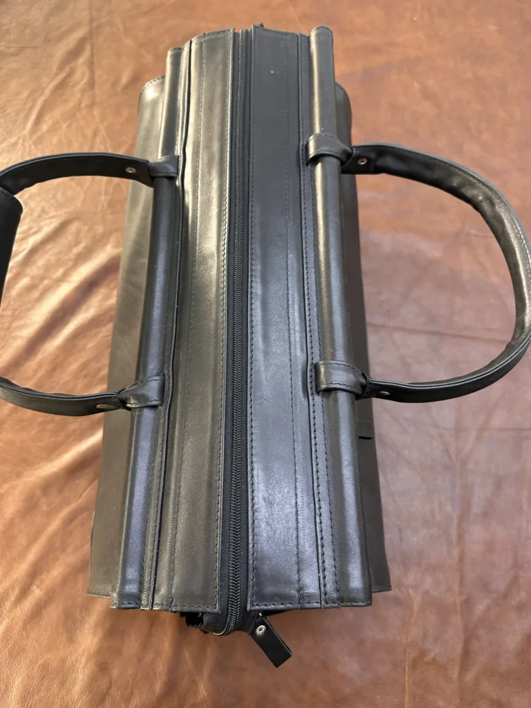 Внутри саквояжа расположены три полноценных отделения и один карман на молнии. Такая организация позволяет эффективно распределить содержимое: верхнее отделение подходит для одежды, среднее — для документов и аксессуаров, нижнее — для обуви или других крупных предметов. Карман на молнии идеален для хранения мелочей, таких как ключи, деньги или билеты. Саквояж удобен в путешествиях, деловых поездках и даже в повседневном использовании, когда требуется быстро и аккуратно уложить необходимые вещи.