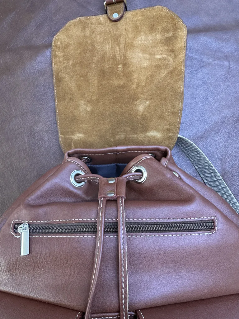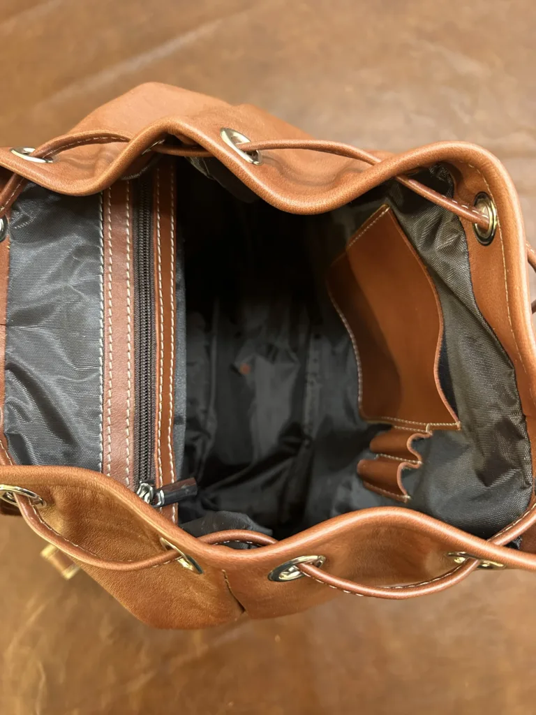 Рюкзак изготовлен из натуральной кожи КРС, что обеспечивает прочность и долговечность. Подкладка внутри выполнена из крепкой синтетической ткани, защищающей содержимое от повреждений. Лямки кожаные, но дополнены стропой для равномерного распределения нагрузки и комфорта при длительном ношении.